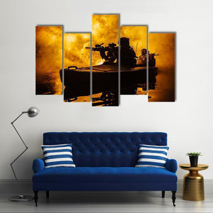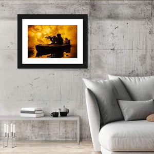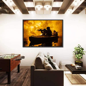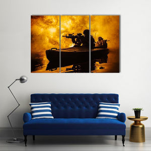 Silhouette Of Special Forces Canvas Wall Art depicts soldiers in a boat, silhouetted against bright orange and yellow smoke with flashes of gunfire for an intense, dramatic scene. The modern, action-packed composition suits contemporary home or office walls as a bold focal piece.