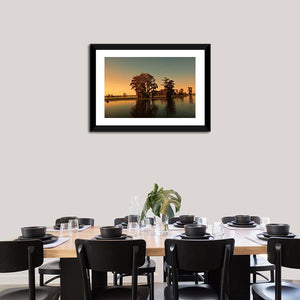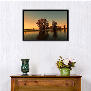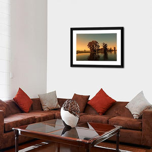 This serene artwork showcases cypress trees reflected in calm waters, bathed in the warm hues of a sunset. The tranquil atmosphere is perfect for enhancing any space with a touch of natural beauty.