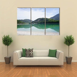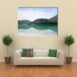 Lake & Mountains Germany shows a mountain lake bordered by forest, a clear sky with a contrail, and a pebbled shore. The scene reads serene and natural, with a blue, green, white, and brown palette. It suits modern or nature-inspired living spaces such as a living room or bedroom.