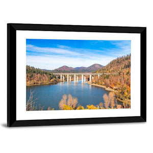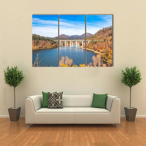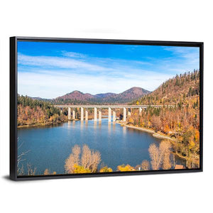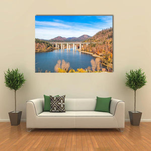 Bridge Over Bajer Lake Canvas presents a realistic landscape of a modern concrete bridge spanning a calm lake, framed by distant mountains and dense trees in fall colors. The blue, green, brown and soft orange palette gives a peaceful, scenic mood. It fits well in modern living spaces where a serene landscape can anchor the room.