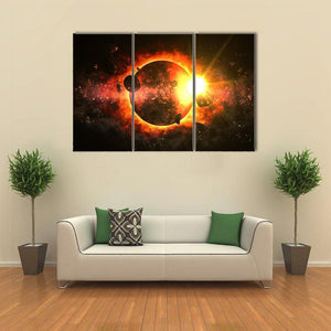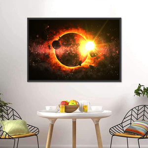 This striking canvas art features a dramatic cosmic scene of a dead planet surrounded by rocky asteroids and a glowing sun. The fiery atmosphere in shades of orange, yellow, and black creates a powerful presence that can elevate any room.
