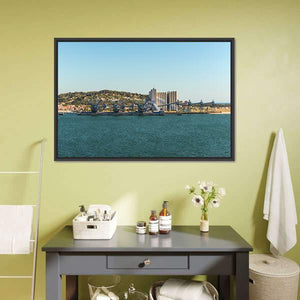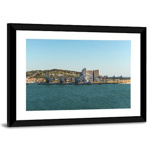 Deep Water Port Portugal Canvas shows a harbor landscape with grain silos, loading cranes and calm water. The realistic, industrial scene uses a blue, teal and grey palette to create a serene, clear mood. It suits modern and industrial interiors as a piece of room decor.