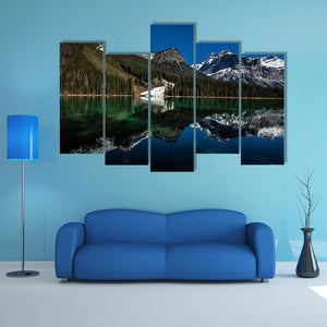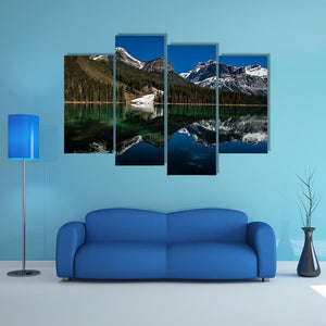 This landscape canvas art beautifully captures a serene scene of snow-capped mountains overlooking a clear lake, surrounded by a lush forest. Its realistic portrayal brings the tranquil beauty of nature into your home.