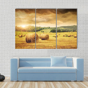 This landscape artwork captures serene hay bales in a golden hour field under dramatic clouds. Its warm palette of gold, brown, and yellow adds a rustic charm, making it a beautiful addition to any wall decor.