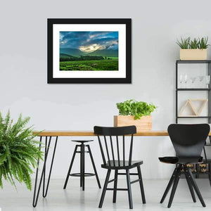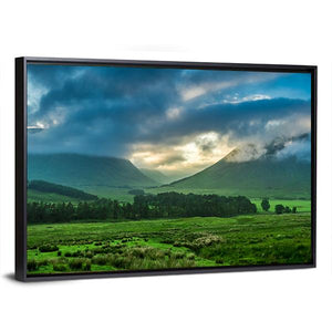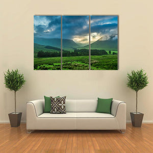 Foggy Sunset in Glencoe shows rolling green hills, forested slopes and distant mountains beneath dramatic clouds, with sunlight breaking through for a serene, natural mood. The muted greens, blues, grays and hints of yellow make it well suited to modern or nature‑inspired rooms as wall decor.