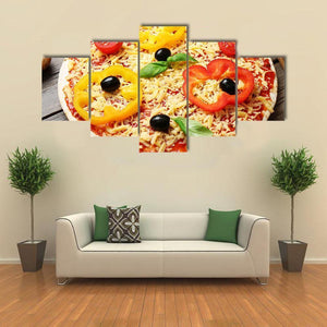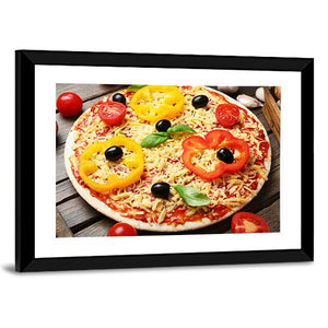 Food Ingredients For Pizza Canvas captures a close-up, overhead view of pizza toppings — bell pepper rings, olives, basil leaves, shredded cheese and cherry tomatoes. Rendered in a realistic food-photography style with a colorful, appetizing palette, it fits kitchens, dining areas, or casual restaurant walls.