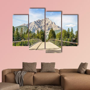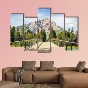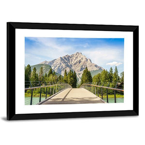 Footbridge Over Bow River Canvas Wall Art shows a realistic riverside scene with a stone mountain peak, trees, a metal-railed bridge, and a clear blue sky. The composition uses blues, greens, grays, and browns to create a peaceful, natural mood. It fits well in modern home décor or nature-inspired rooms.