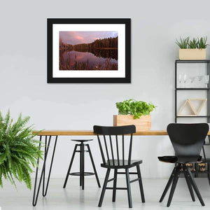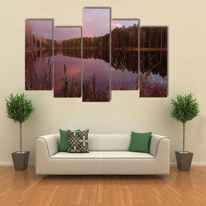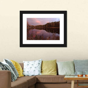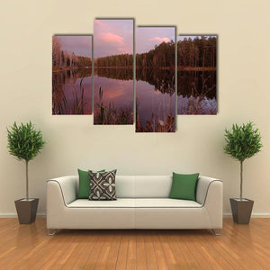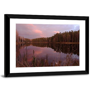 This realistic landscape shows a forest lake at dusk, with trees and reeds reflected in calm water. A cloudy sky with pink and purple hues gives a serene, atmospheric mood; the rule-of-thirds composition makes it a quiet focal point for modern or nature-inspired rooms.
