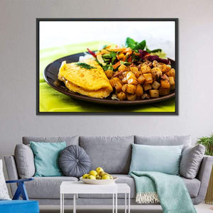 Omelette With Potatoes Canvas Wall Art presents a close overhead view of a folded omelette, seasoned cubed potatoes and a side salad with mixed greens and shredded carrots. Rendered in a realistic style with warm yellows, browns, greens and a touch of red, the image feels appetizing, fresh and hearty—suitable for a kitchen or breakfast nook with modern decor.