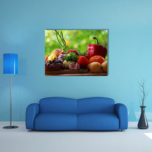 A photorealistic close-up of fruits and vegetables on a tabletop, featuring a red bell pepper, tomatoes, onions, garlic, olives and potatoes. The image reads fresh, healthy and vibrant in red, green, brown and white tones. It suits home room decor and food-themed spaces that want colorful, modern canvas art.