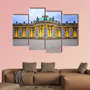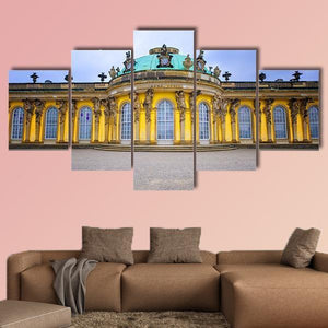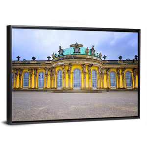 Sans Souci Palace Canvas Wall Art presents the palace’s classical architecture with ornate roof decorations, arched windows and a visible dome in a centered, symmetrical composition. Its muted yellow, blue, green and grey palette and grand, historical mood suit classical or architectural interiors and room decor.
