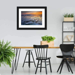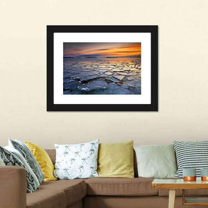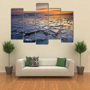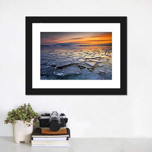Featuring ice floes drifting across a calm ocean at sunset, this canvas evokes a serene yet dramatic atmosphere. Textured ice and streaked clouds catch blue, orange and yellow tones on the reflective water. Suited to modern or nature-inspired rooms, it adds a quiet coastal mood to home decor.