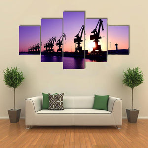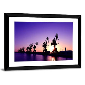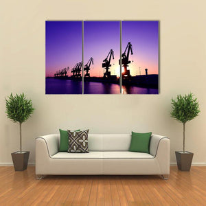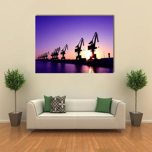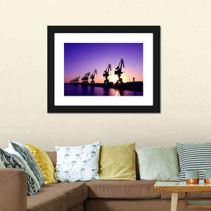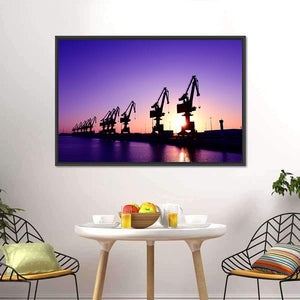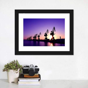 Shipyard cranes stand in silhouette against a purple-and-orange sunset over a harbor, with reflections on the water. The scene blends serene and dramatic industrial moods and follows a rule-of-thirds composition. It works well in modern or industrial home interiors as bold wall art.