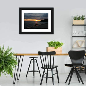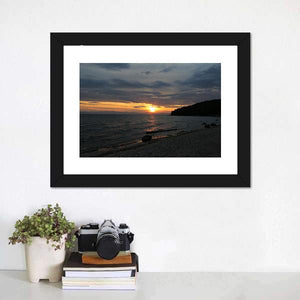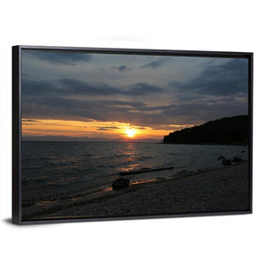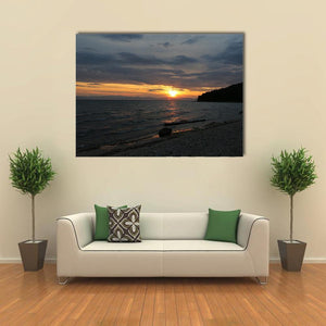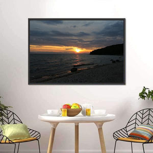 Baikal Lake, Russia is captured in a realistic sunset landscape with the sun breaking through clouds, calm water reflections, a pebble beach, and a tree-covered hillside. The scene reads serene and peaceful, with orange, blue and gray tones that fit modern or nature-inspired rooms. This canvas wall art brings a tranquil, natural atmosphere to room decor.