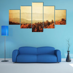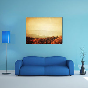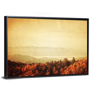 This canvas print features a stunning landscape of the Great Smoky Mountains, showcasing a serene mountain range intertwined with lush forests. With a warm color palette of orange, yellow, green, and brown, it adds a peaceful atmosphere to your space.