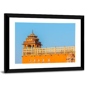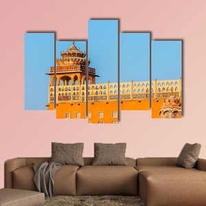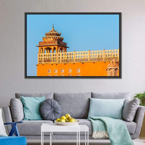 Hawa Mahal Jaipur Canvas Wall Art depicts the ornate facade of the Hawa Mahal with its arched windows and domed elements, seen from a low, centered angle. The photorealistic print pairs warm orange and gold with blue and white accents for a historic, majestic, and vibrant atmosphere. It fits well as room decor in modern interiors that appreciate architectural detail.