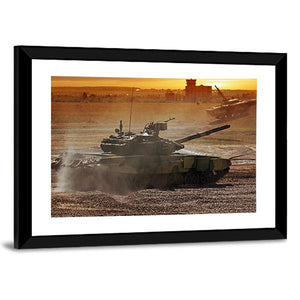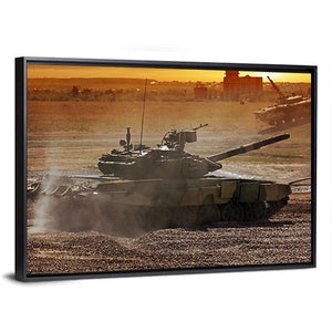 Two tanks push through a dusty field at dusk, rendered in realistic detail with a powerful, active, dramatic mood. Warm greens, browns and orange light from the setting sun and kicked-up dust add depth and perspective, making it a strong fit for modern living rooms or a home office.