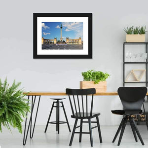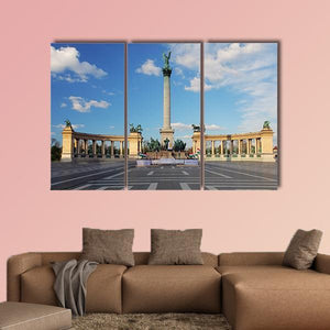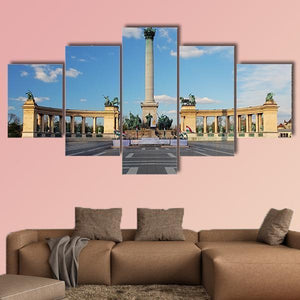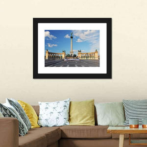 Heroes Square in Budapest captures the city’s grand memorial plaza with a central column topped by a statue, horses on pedestals, and classical archways arranged in careful symmetry. Rendered in a realistic landscape style, the print uses blue, gray, white and tan tones to convey a formal, grand mood. It works well in living rooms, entryways or offices and complements modern or classical room decor.