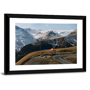 A realistic landscape showing a winding mountain road leading toward snow-capped peaks, with a small orange tent and cars parked at a campsite. The brown, white, blue and orange palette creates an adventurous yet serene, remote mood that works well in modern home decor such as living rooms or entryways.