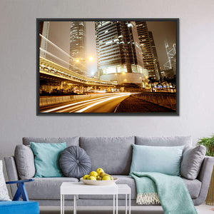 This vibrant cityscape captures the energy of a bustling highway at night, showcasing light trails and towering skyscrapers. Its dynamic perspective and warm color palette make it a lively addition to any urban-themed decor.