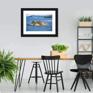 This realistic landscape art features charming red houses on an island, surrounded by blue waters and a green boat. Its serene and peaceful atmosphere makes it a lovely addition to any decor.