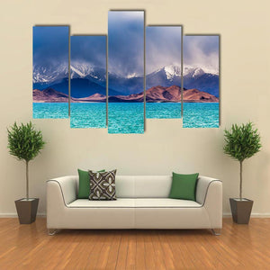 Karakul Lake in the Pamir is shown in a photorealistic landscape of snow-capped mountains, turquoise water and stormy clouds. The composition uses rule-of-thirds balance and depth to create a dramatic yet serene scene that suits modern living rooms and nature-themed spaces.