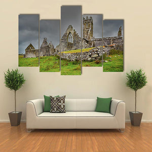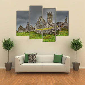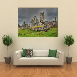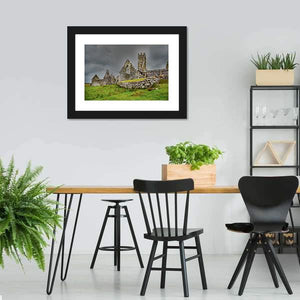 This landscape artwork captures a ruined stone abbey amidst grassy hills under a cloudy sky. With its rustic and vintage style, it evokes a dramatic and historical atmosphere, perfect for adding character to your space.