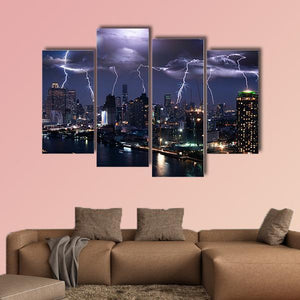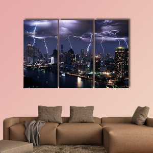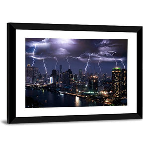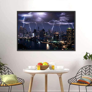 Lightning Over City depicts a photorealistic city skyline at night, with numerous lightning strikes arcing over a river and illuminated buildings. Dark, stormy clouds and a blue-purple palette create a dramatic, energetic, awe-inspiring atmosphere. This canvas suits modern living rooms or offices as bold wall decor.