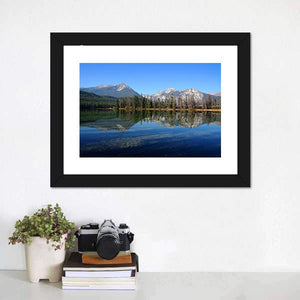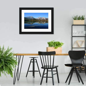 A realistic landscape of snow-capped mountains reflected in a clear blue lake, with trees and forest along the shore. The symmetrical composition and blue, green, white, and brown palette create a serene, calm, majestic mood. Suited to modern home decor and room settings that favor nature-inspired wall art.