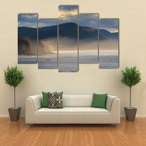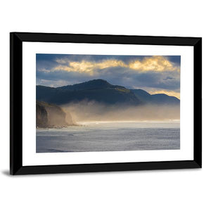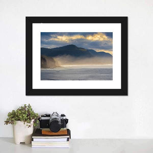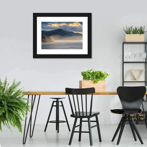 Coast Of Coal Cliff Canvas Wall Art depicts coastal cliffs and the ocean caught in a misty morning, with sunlight breaking through cloud cover. The modern landscape painting uses blue, green, gray and yellow tones to build depth and a calm yet dramatic atmosphere. It suits house interiors with modern or coastal-inspired decor.