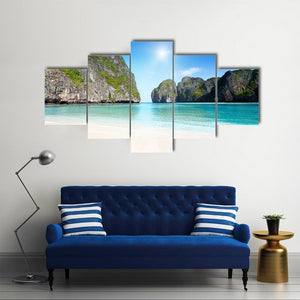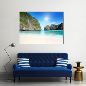 Bring the serene beauty of a tropical beach into your space with the Morning In Maya Bay canvas wall art. This realistic piece captures the vibrant turquoise waters, lush green cliffs, and the bright sunlight of a peaceful day at the bay.