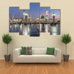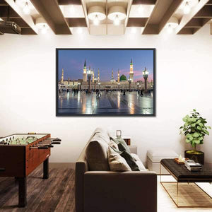 This canvas art beautifully captures the majestic Prophet's Mosque in Medina, showcasing its stunning minarets and illuminated courtyard against a serene twilight sky. The photorealistic style and tranquil color palette of blues, pinks, and golds add a spiritual ambiance to any space.