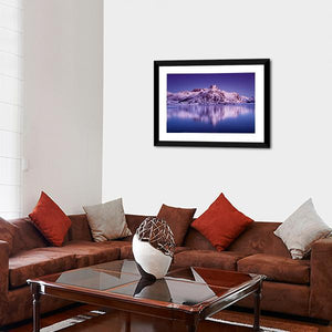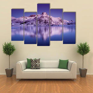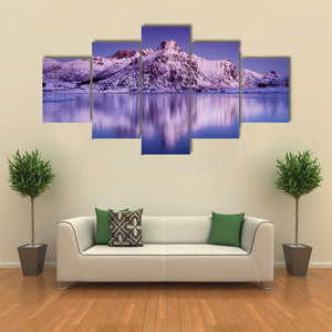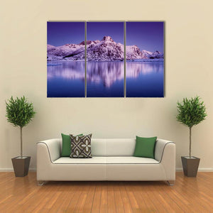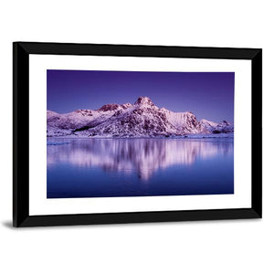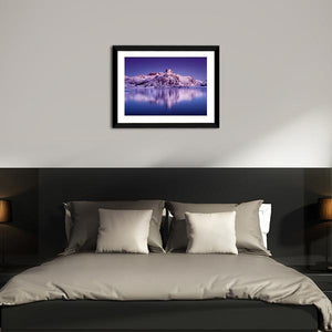 Snowy mountain ridges and a calm lake reflection form a symmetrical landscape in cool blues, purples, white and gray, giving the scene a serene, tranquil, majestic mood. The piece follows a modern style and works well in modern home interiors and room decor.