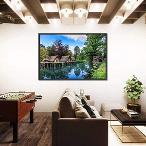Straw Houses In Bally Park features stilt houses beside a calm lake, thatched roofs, stone ruins to the right, and crisp reflections in the water under a blue sky. Rendered in a realistic nature photography style, it feels peaceful and serene and suits nature-themed or modern rooms.