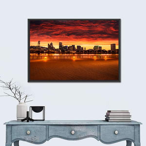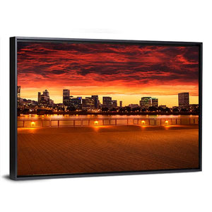 This canvas art features a vibrant city skyline set against a dramatic sky. With its realistic portrayal of illuminated buildings and a waterfront promenade, it adds a stunning urban touch to your decor.