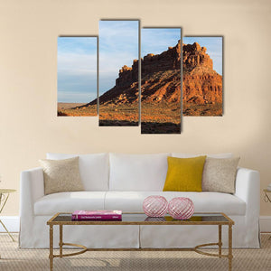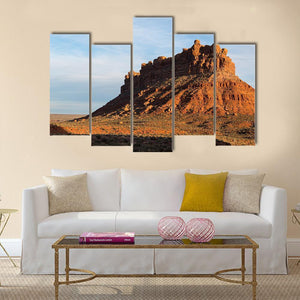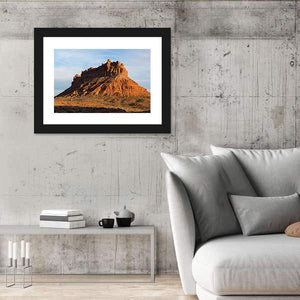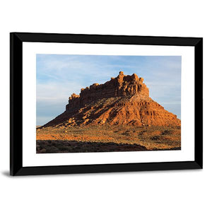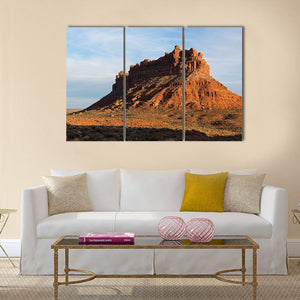 A landscape of layered rock formations, desert vegetation and open sky in Utah, captured in warm orange, brown and blue tones for a serene, majestic mood. The rustic, nature-focused print suits modern or rustic home decor and nature-inspired spaces.