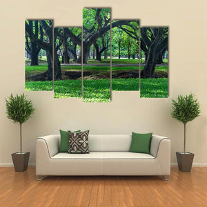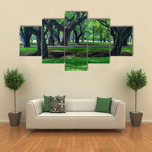 Park at Sukhothai in Thailand shows a realistic, peaceful park scene with trees, a manicured lawn and sunlight filtering through a dense canopy. Greens, browns and black tones build depth and a natural, calming mood. Suited as room decor in a modern home or living area.