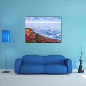 This landscape canvas art showcases the majestic red sandstone cliffs of Scotland, framed by a serene ocean and a bright blue sky dotted with white clouds. Its natural colors and gentle waves create a peaceful atmosphere, perfect for enhancing your home decor.