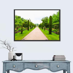 Regent's Park Landscape In London shows a centered gravel garden path lined with tall cypress trees and neatly trimmed grass. The photorealistic scene — in greens, beige, white, and brown — feels serene, ordered, and naturally calm. It suits calm, nature-inspired interiors and modern décor.