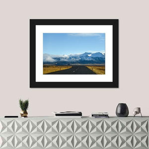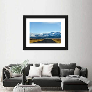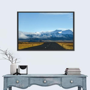This landscape canvas art features a serene road leading towards majestic, snow-capped mountains under a vast sky. Its tranquil palette of blues and earthy tones captures the openness of nature, making it a fitting addition to any room decor.