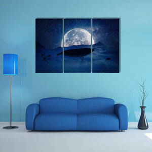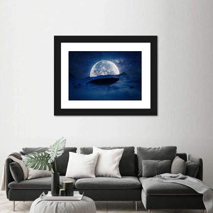 Silhouette Of A Whale Canvas Wall Art features a silhouetted whale and smaller fish drifting beneath a full moon in a surreal, tranquil nightscape. Deep blues, black silhouettes, and white moonlight create depth and a majestic, dreamlike scene with stars and nebulae. Suited to modern home and room decor, it provides a calm focal point for living spaces.