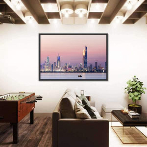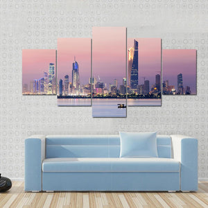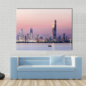 This captivating canvas art captures the serene skyline of Kuwait City at twilight. The illuminated buildings reflect beautifully against the calm waters, set against a stunning pink and purple sky, making it a perfect addition to any urban-themed decor.