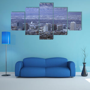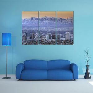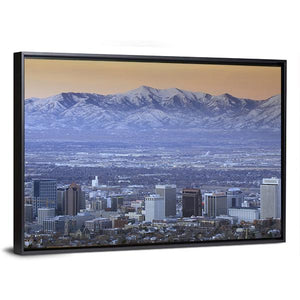 This canvas art captures the stunning skyline of Salt Lake City, featuring majestic snow-capped mountains in the background. The spacious and serene atmosphere makes it a beautiful addition to any modern decor.