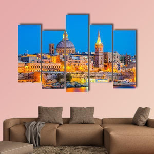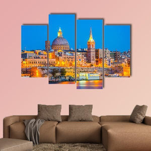This canvas captures the nighttime skyline of Valleta, Malta, showing domes, spires and a glowing waterfront. The illuminated, vibrant yet serene palette of blues, golds and warm browns creates a calm focal point for modern wall decor.