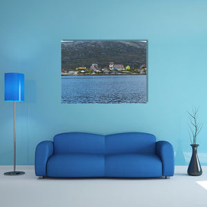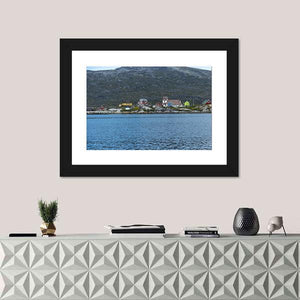 This landscape art captures the serene beauty of a village nestled between tranquil waters and majestic mountains. Featuring colorful houses against a backdrop of rocky hills, it adds a peaceful touch to any space.
