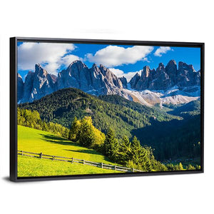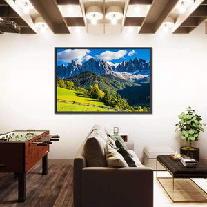 Sunny Day in Dolomites captures a mountain range with jagged peaks, a sunlit meadow, pine trees and a simple wooden fence beneath a cloud-streaked sky. The rule-of-thirds composition and a blue-green palette create a serene, bright, majestic mood that fits rustic or modern room decor.