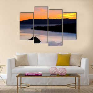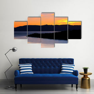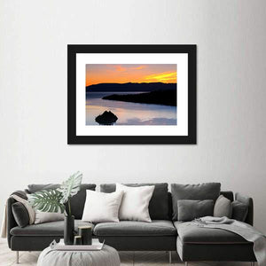 Sunrise Over Emerald Bay captures a peaceful lakeside scene with an island silhouette, distant mountains and soft clouds. Warm orange and yellow sunrise tones blend with blues and purples over calm water for a serene, modern look that suits contemporary or nature-inspired rooms.