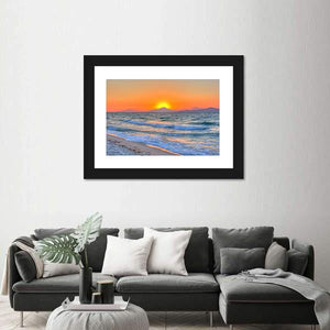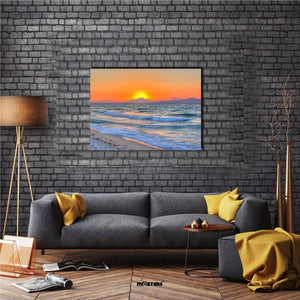 This stunning canvas captures the serene beauty of a sunset over the Aegean Sea, with waves gently breaking on the shore and mountains framed in warm hues. The tranquil scene adds a picturesque touch to any room.