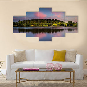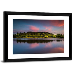 Sunset At The Pond presents a lakeside sunset with trees, sky and clouds mirrored in calm water. Soft blues, pinks, greens and brown tones — including pink clouds reflecting in the pond and a dark blue sky with hints of pink and orange — create a tranquil, peaceful mood that suits modern home living spaces.
