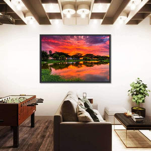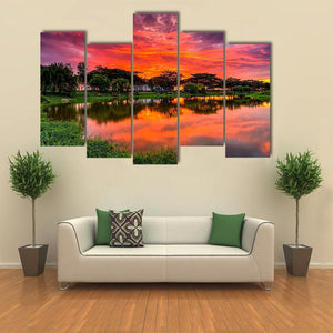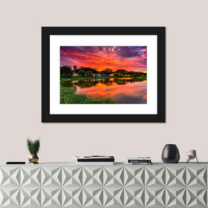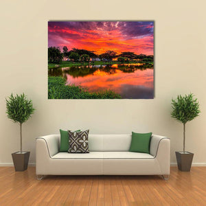 Sunset Over Lake With Tree Reflection shows a fiery sunset over a calm lake, with dramatic clouds and a tree mirrored in the water. The realistic landscape blends orange, red and purple with green and brown for a dramatic, serene and vibrant mood, well suited to modern home wall decor.